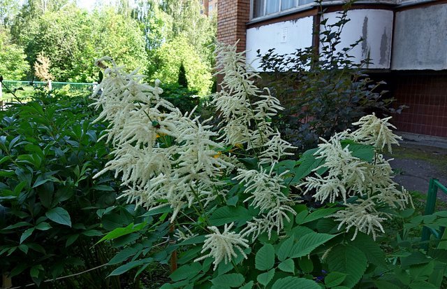 Высокие цветы пушистыми белыми метёлками. В ходе импровизированной экскурсии я узнала, что это растение называется волжанка или арункус (лат. Aruncus).