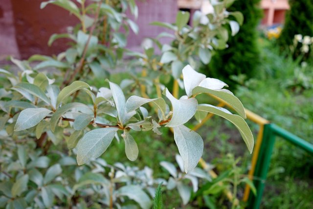 Кустарник с покрытыми серебристым пухом листьями, поэтому кажется, что листья серебристые. И название у него немного обидное на русский слух: лох серебристый ((лат. Elaeagnus commutata).