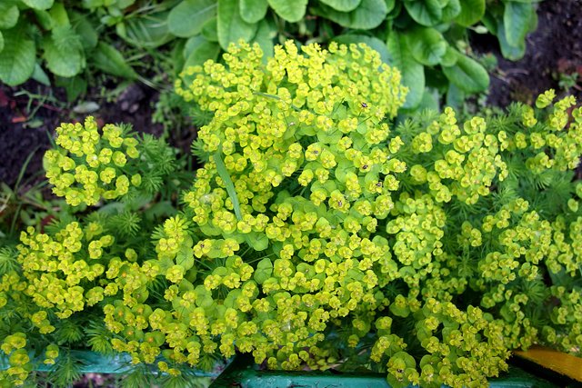По бордюру высажен Молочай кипарисовый. Цветки зеленоватые и не очень заметные. Но если поближе рассмотреть, они очень интересные.