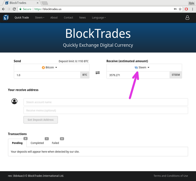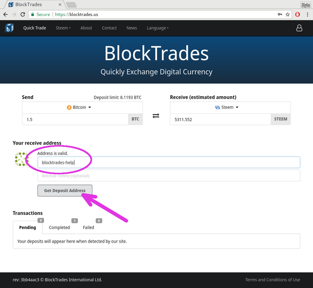 Ang pahina ay gagawa ng nagiisang address para ipapadala ang iyong cryptocurrency sa (BTC, BCH, Dash, Doge, ETH, LTC, XMR) o bibigyan ka ng kaparehong address / common address na may Unieque memo (BTS, Steem) kasama sa mga habilin ang pag sunod sa pagsimula sa iyong exchange.