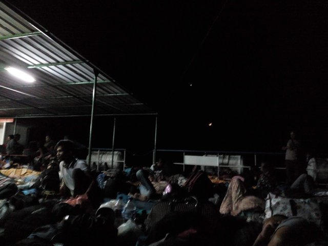 Di geladak pun penuh sesak oleh tikar dan penumpang yang masih duduk-duduk menanti kapal bergerak. Akhirnya kau mendapat satu lapak lowong di dekat knalpot. Dan kau tidak punya tikar, terpaksa kau menyewa matras busa tipis dari awak kapal. Dua puluh ribu. Mahal, tapi tak apalah bisa sedikit lebih empuk daripada harus rebah di atas lantai baja selama delapan sampai sembilan jam.
