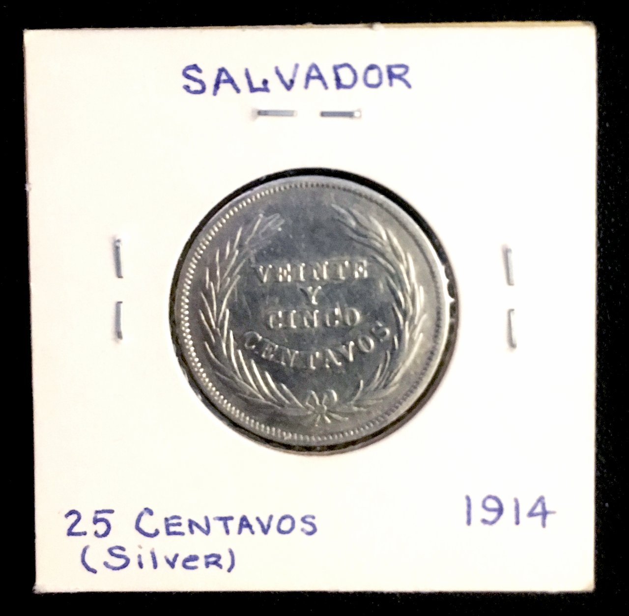 The first coin came from a local shop and is made from silver. The front shows the pyramid from their national flag. The back is spelled out, "Twenty Five Cents." The second coin is two cents and came from an Airbnb in San Salvador. It's in great condition.