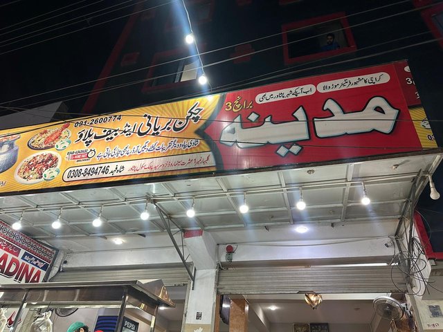 Madina Chickenn Biryani and Beef Pulao is located in Anam Sanam Chowk, Gulbahar, immediately adjacent to Cinema Road on Peshawar's famous food street. It is approachable by public transport, rickshaw, or personal car. Since it lies on the premises of a food street, individuals from the other part of the city can easily locate it.