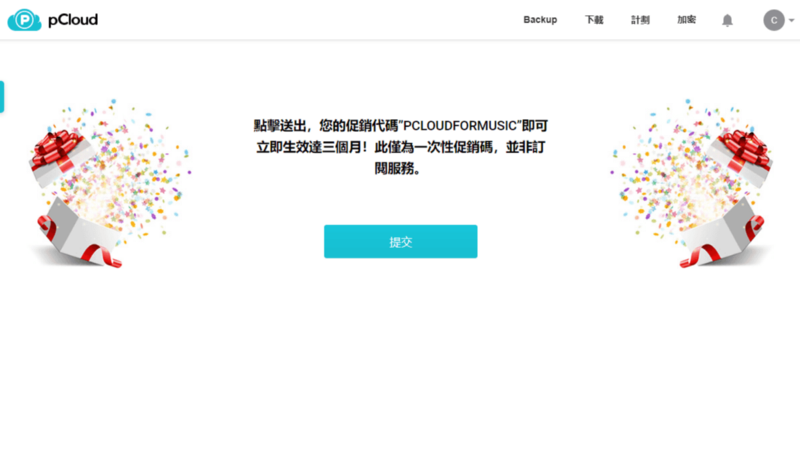 目前 pCloud 有提供一個限時的優惠序號,無論新舊會員,都可以在免費註冊或登入後,到指定頁面填入「PCLOUDFORMUSIC」的專屬優惠碼,即可獲得高達 500 GB 的免費儲存空間,而且時間持續長達 3 個月,可以點此連結前往索取。