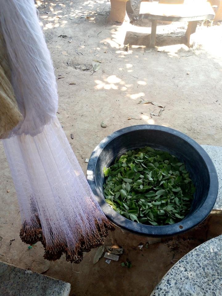 วัตถุดิบที่ใช้ในการย้อมสีแหก็เป็นที่ได้จากธรรมชาติหาได้ในท้องถิ่น และวันนี้ตาเพียรเลือกใช้ ใบอ่ำไอ่ ผสม เลือดวัว (ใบอ่ำไอ่เป็นชื่อในภาษาอีสาน ไม่รู้ว่าภาษากลางเรียกว่าอะไรเหมือนกันค่ะ 😄 มีลักษณะเถาเครือ พบได้ตามป่าและทุ่งนา)