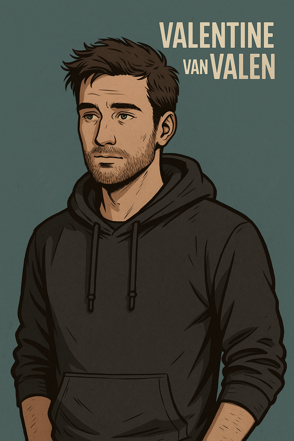 Valentine van Valen sits hunched over his laptop, hoodie pulled tight, a half-empty coffee mug beside the keyboard.