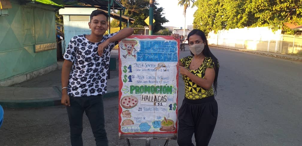 Junto al aviso del local de Venta de Pizzas, al fondo el tráiler de comida, en la foto @crissanch, @risedaniel, y @shoday junto a mi persona @edlili24, ///blusa.soñada.sabios, Barquisimeto Lara Venezuela.