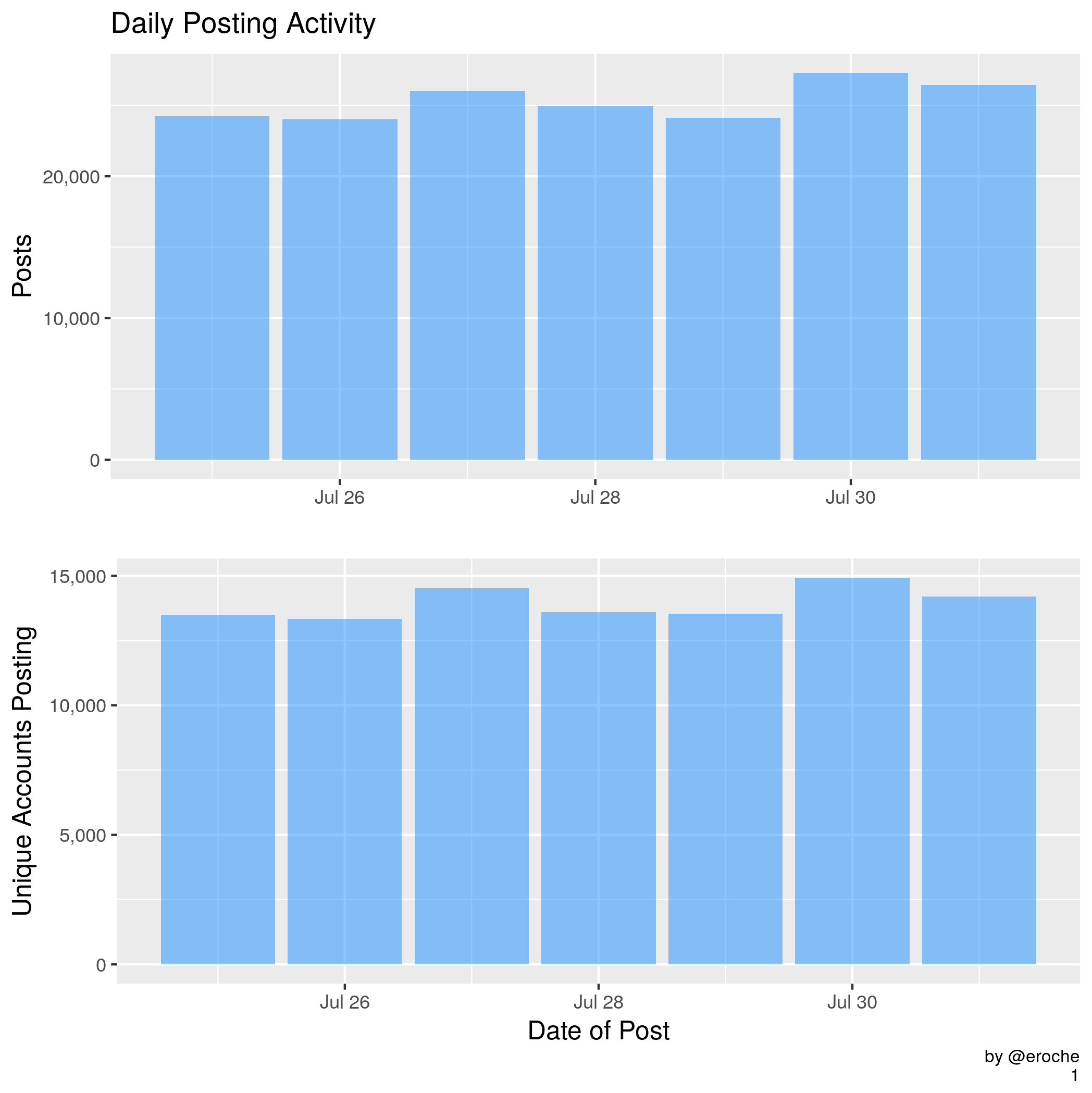 In the past 7 days there was a total of 177k posts from 39k unique accounts. That gives an average of 5 posts in the week for authors that were posting. The next graphs shows the breakdown of these figures on a daily basis.