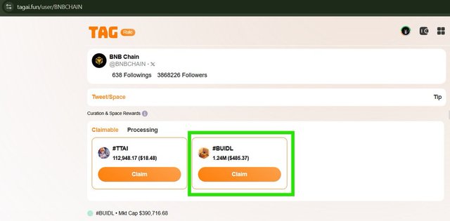 #BUIDL #TagAIgunulsai.tagai (60)in TipTag • 2 days ago #BUIDL #TagAI Hey @BNBCHAIN , did you forget claim your reward from @Buidl_BNB community ? 🙄 1,24M $BUIDL (over 480$) is waiting for you... Only need connect your account to @TagAIDAO platform (https://tagai.fun/) and claim it! ✅ #BUIDL #TagAI