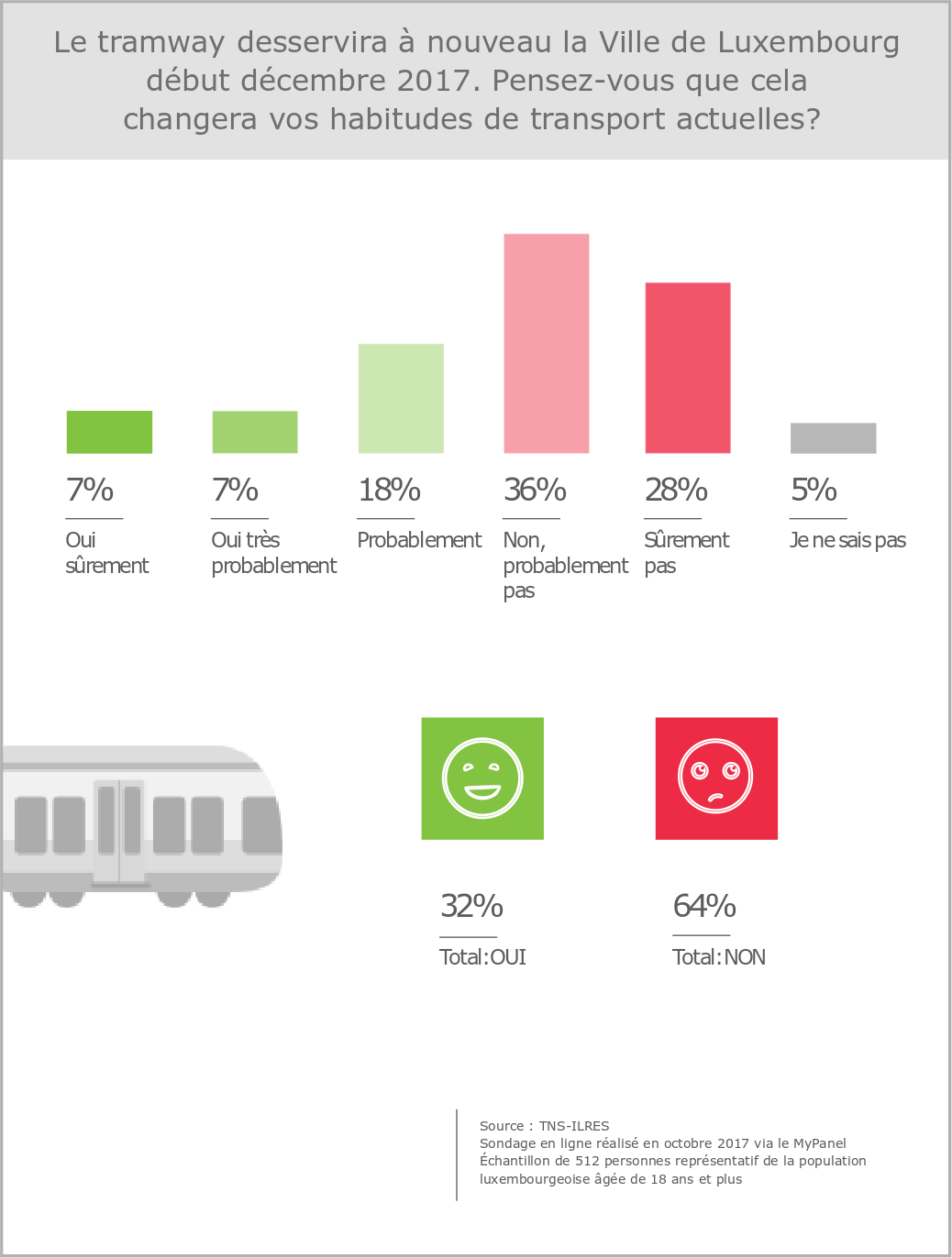 Un tiers des répondants assure que la desserte par le tramway de la ville de Luxembourg changera leurs habitudes actuelles de transport ! Les plus jeunes sont les plus enclins à revoir leurs habitudes avec respectivement 41% chez les 18-24 ans et 31% chez les 25-34 ans qui affirment qu’ils changeront leurs habitudes de mêmes modales de déplacements. Les personnes âgées entre 55-64 ans estiment elles-aussi qu’elles changeront leurs comportements (36%). En outre, c’est au sein même de la capitale et de sa banlieue que les enquêtés estiment que le tramway fera évoluer leurs habitudes de transport actuelles. En effet, 43% des résidents de la Ville de Luxembourg et 38% de ceux des localités périphériques pensent qu’ils changeront leurs habitudes actuelles. Opinion à l’opposé des habitants des autres régions du pays qui estiment que la mise en place du tramway n’affectera aucunement leurs habitudes. On retrouve ainsi 71% des personnes dans le Sud et l’Est et 67% dans le Nord qui ne changeront pas leurs comportements.