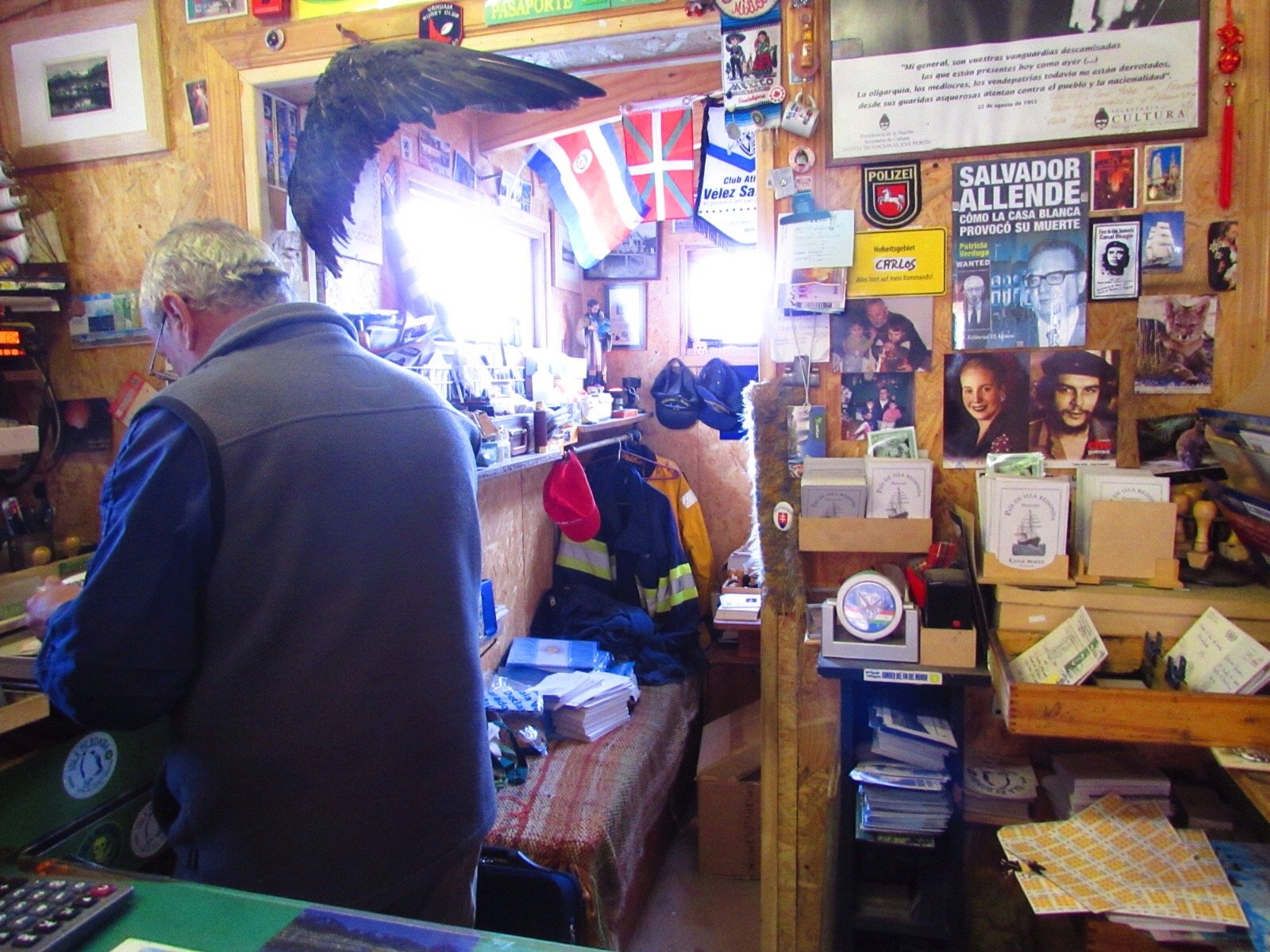 Inside it appears as if time has stood still. There is a wood-burning stove in the corner, indispensible in this part of the world where at the height of the southern hemisphere summer we were wrapped in thick coats, hats and scarves. The walls are covered with postcards, souvenirs for sale and posters. Marine relics hang from the ceiling, such as the cormorant wing over the counter. There is also a display of the different postmarks you can get when you mail your postcard from the end of the world.