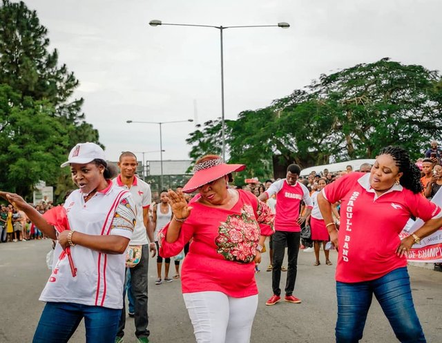 Senator Florence Ita Giwa (center) and other members of the Seagull Band during the dry run ahead of the annual Calabar Carnival.