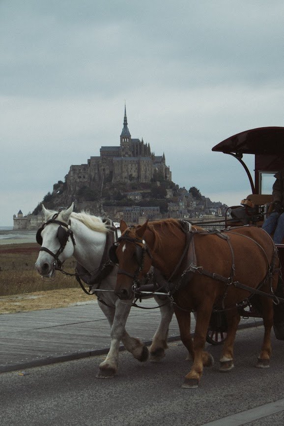 There weren’t too many cars that early in the morning but we certainly weren’t alone. Following a long renovation, the parking lot had been moved far away from the site to allow it to become an island again at high tide. To get there, we could either ride a shuttle bus or get in a horse drawn carriage. Alternatively, we could just walk and enjoy the view all the way to the site.