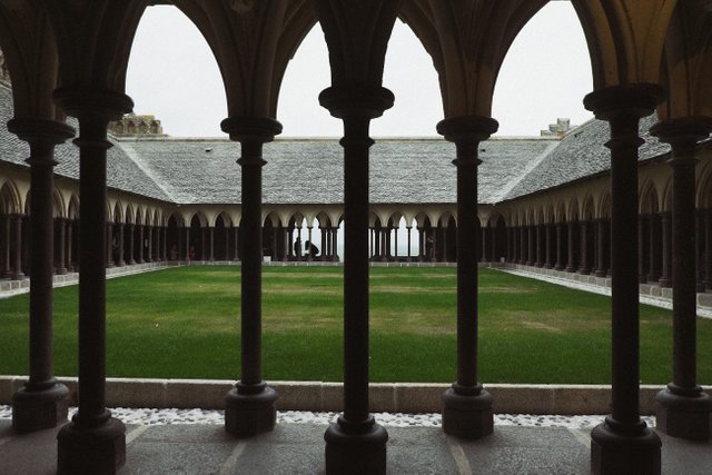 We then walked from the viewing platform to the monk buildings of the Merveille, considered as the architectural masterpiece of the abbey. The construction followed a Gothic pattern and lasted for 17 years, its architecture consisting in 3 layered levels culminating in a height of 35m. Next to the Merveille, we entered the cloister, on top of all abbey buildings. Three of its arches were opened to the outside, feeling like the cloister-garden was suspended in the air.