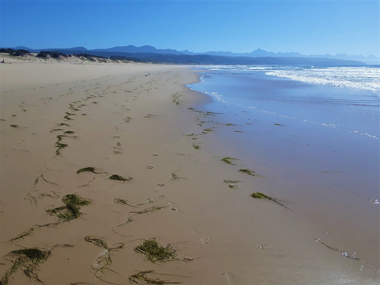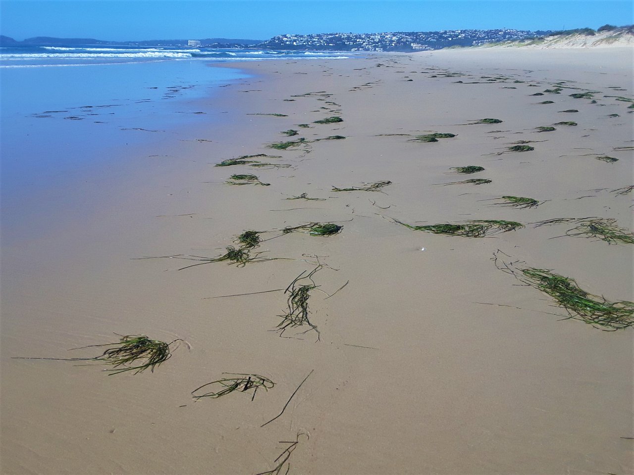 Today the tide was really low, so it made some fascinating reflective patterns in the puddles left by the lingering sea water. The ripples on the sand that would normally be covered by ocean looked quite curious with their undulating patterns. You can see that the tide had been rough and somewhat stormy prior to my arrival. The washed-up fresh green river grass is a clear indication that the current was strong and the water quite rough, to wash so much river grass out of the mouth of the lagoon and out to sea, where it then gets washed up on the pristine white sandy beaches.