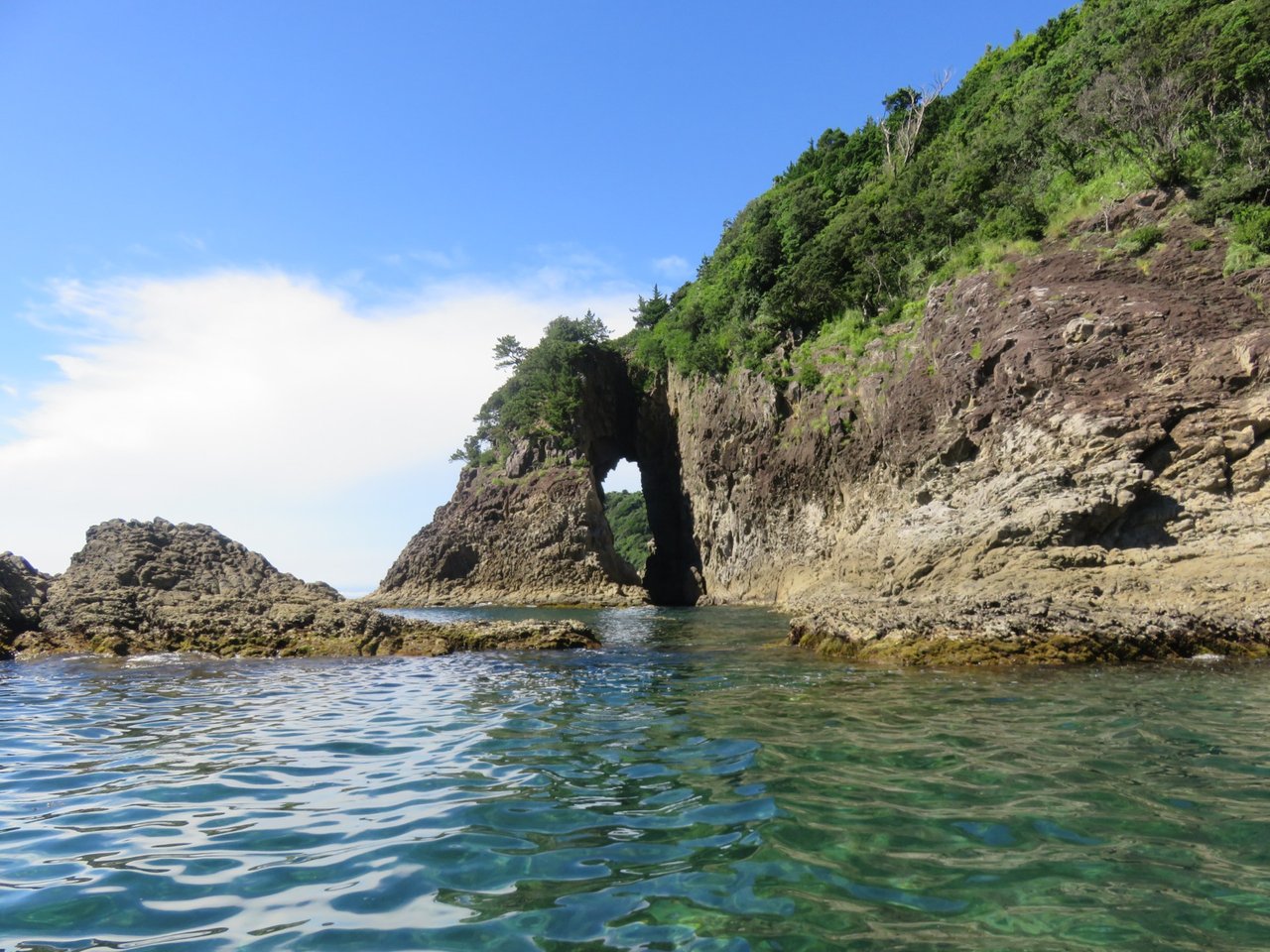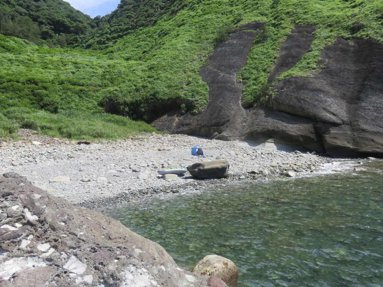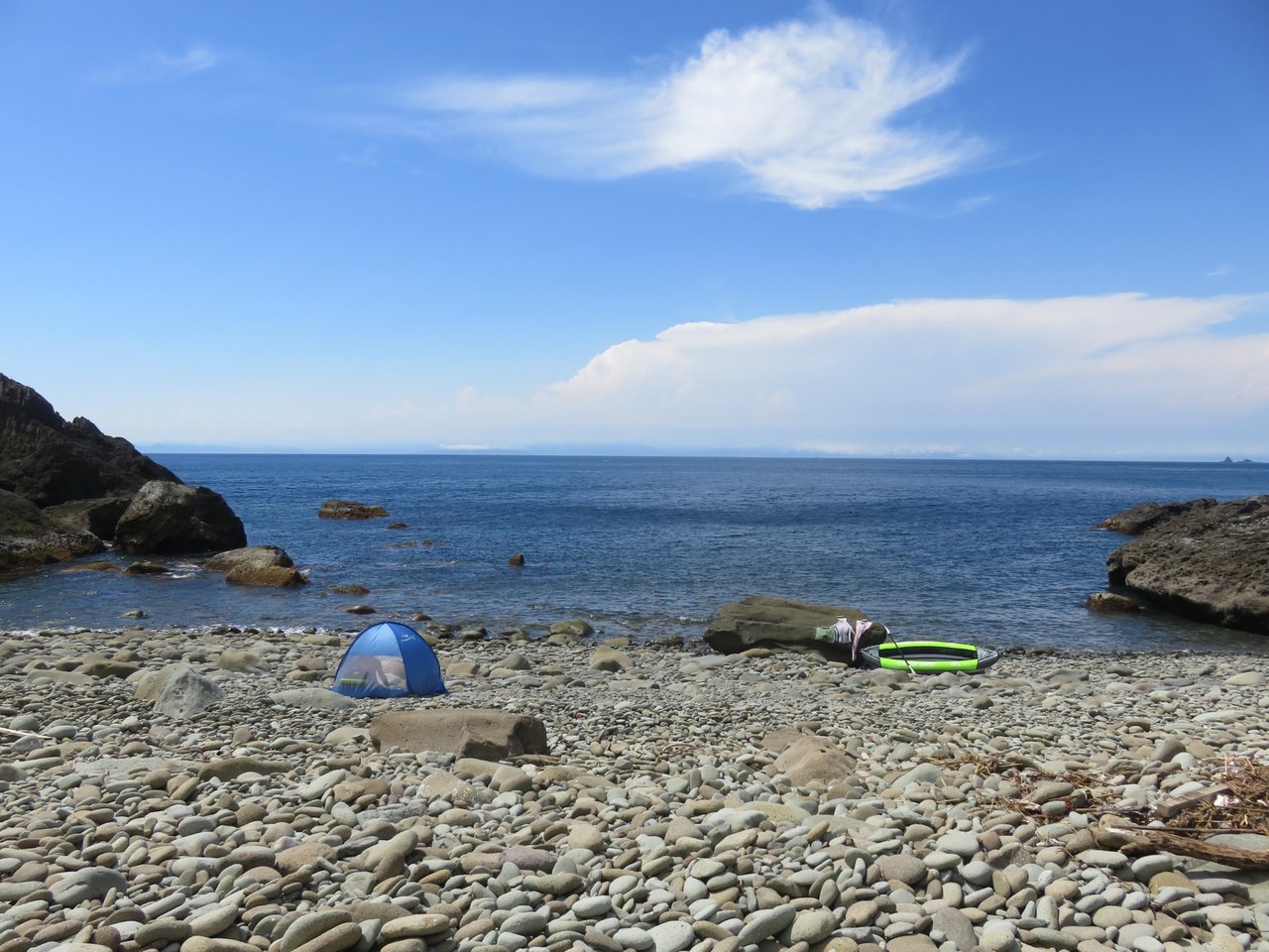We parked along the little road to the dried up hot spring here, and set up our canoe, then explored the bay and went round cape Kurosaki and pitched our little beach tent here for a while, ate lunch, went exploring and then came back to the same bay as before and explored the other side of the bay, which had some amazing caves.