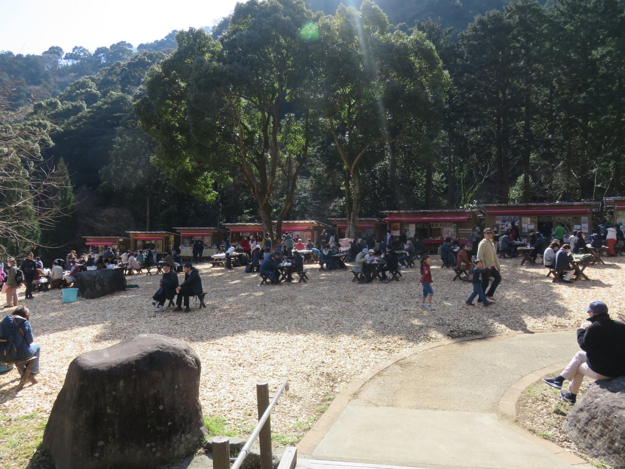 On your left will be an open space with stalls and seating, in front is the mountain with the plum blossoms and if you walk past the open space up the path along the river, you can find the hiking paths around the area.