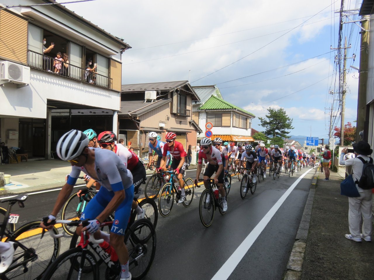 After a while cars started appearing, then many many motorbikes and finally the race. There was a breakaway at the time, so we saw two groups going by. Everyone in the village had come out to watch it. It was like a festival. I actually thought there would be no-one because of the virus, but afterwards I watched the race on TV and saw so many people watching the race going through Tokyo. Hehehe.