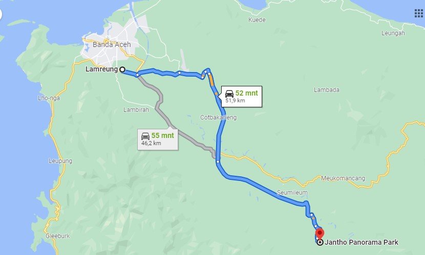 Jantho Panorama Park is located on Meusara Hill, Jantho City, Aceh Besar District. The journey from my house in Banda Aceh to this place is approximately one hour. If you want it to be shorter, it can be reached via Toll Road. Banda Aceh and Aceh Besar are two districts that are close to each other, so what is tourism in Aceh Besar is also tourism for Banda Aceh. To reach this place you can use the map on [pinemapple]([//]:# !pinmapple 5.283932 lat 95.602617 long Jantho Panorama Park d3scr)