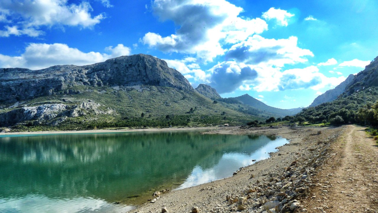 Then work is already waiting again. Walking on the moon of Mallorca. No grass, no trees, no animals here in the heights of the isle. Over the Coll de Cards, which is still 963 meters high, we return to the Mallorcan plain. Below, the picturesque Cüber reservoir awaits, which is enormously important for the island's water supply. What looks like all the way down is still high: at 750 meters above sea level, the water is dammed here, a huge expanse of water that duels with the sky for the most beautiful blue.