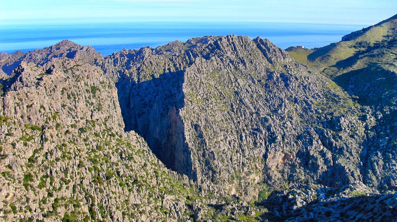 Only shortly before reaching the pass follow some zigzag switchbacks. To reach the summit, we must hike around the steep west wall uııd over the Coll des Prat (1,200 m). Finally, however, we stand on the second highest mountain on the island and can look far across the plain, the coves to the north and the Puig Major can be let roam. A sharp wind blows up here and because of the zigzag turns on the way we puff heavily. The view back down the Orangental of Sóller is stunning.