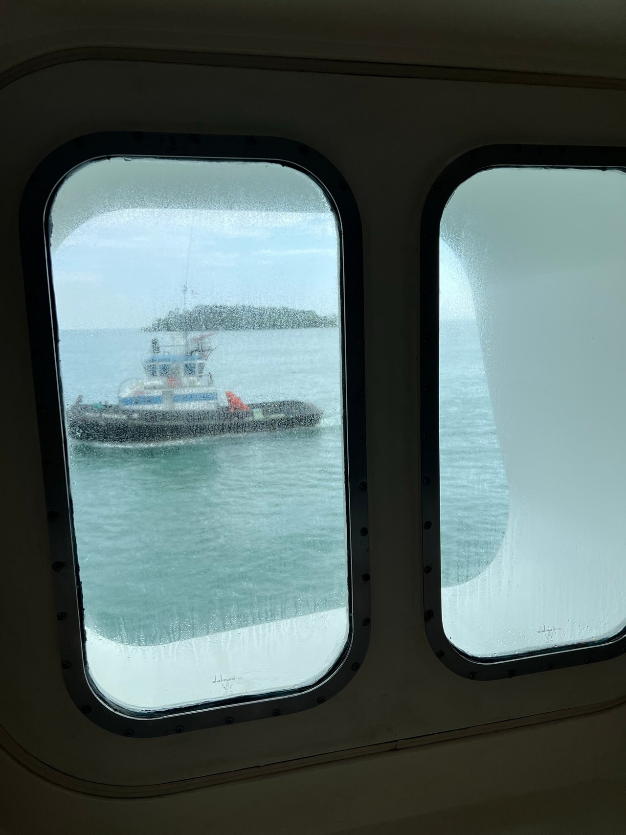 We went up on deck before breakfast early, 20 km before arriving at the port.