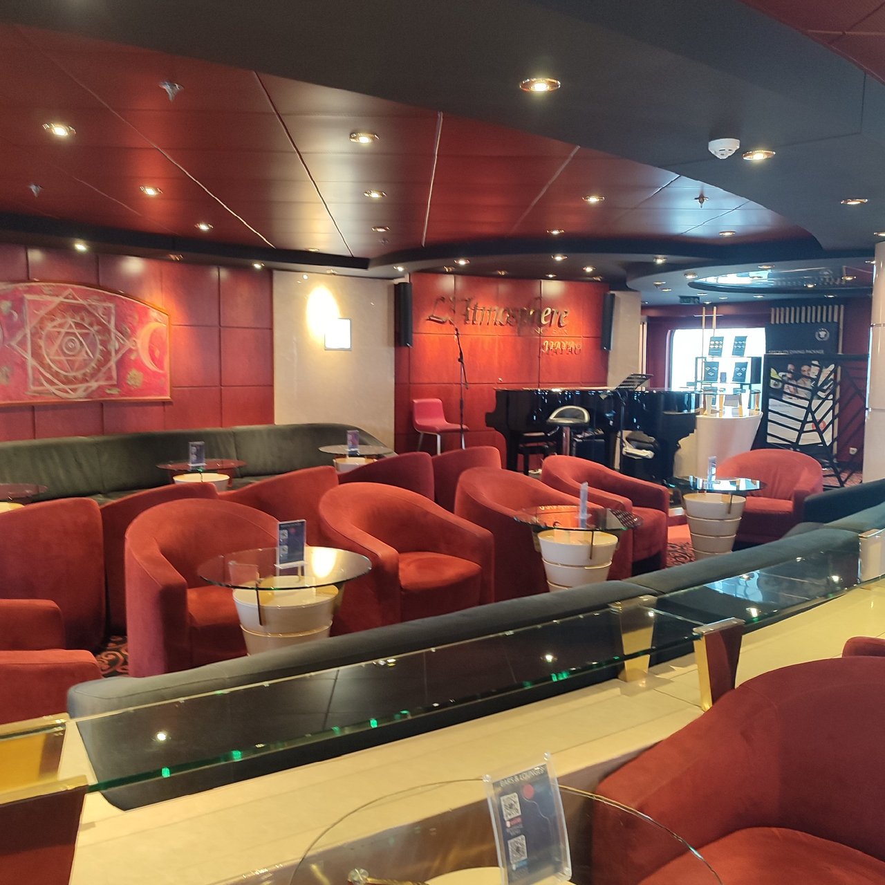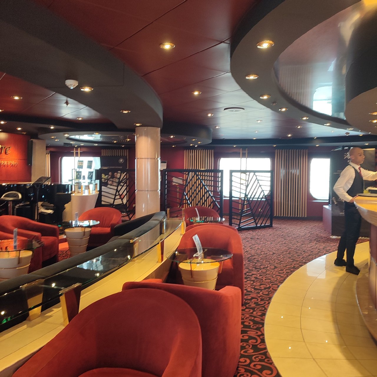 Some pictures of us in the cruise stairs and of some bar ( the red is the cabaret bar, the blue the disco bar) of the cruise, almost empty when we arrived but extremely full during the evening.