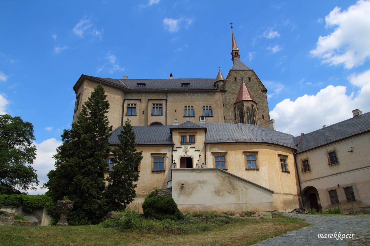 We park in the parking lot under the castle hill and continue on foot. It is not far. The castle is located in the city and the parking lot is in the old part of town. In a few minutes we stand in front of the castle gate and buy a ticket. We are lucky. There is currently no one in the courtyard, I can photograph the castle in full beauty. This photo suitably complements the blue sky. A white cloud appears here and there.