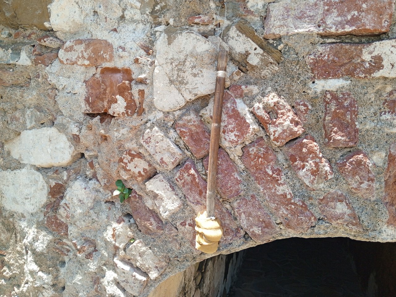 La otra estructura llamativa que se encuentra en el patio, es ese agujero que se observa hasta el fondo en la pared de piedra, esta era la letrina, allí, los guardias del castillo, hacían sus necesidades fisiológicas. En la entrada se encuentra esta esponja, el papel toillet de la época, con ella se limpiaban luego utilizar la letrina.