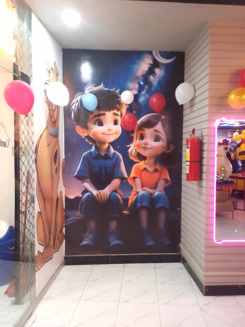 The walls are decorated with beautiful posters of cartoons, colorful artwork, and wooden designs on the ceiling. Bright lighting makes the whole place look even more attractive. On the left side, there is a café where you can buy snacks and drinks, and on the right side is the token counter. From here, you buy different tokens for the games. Everything is displayed clearly with token prices.