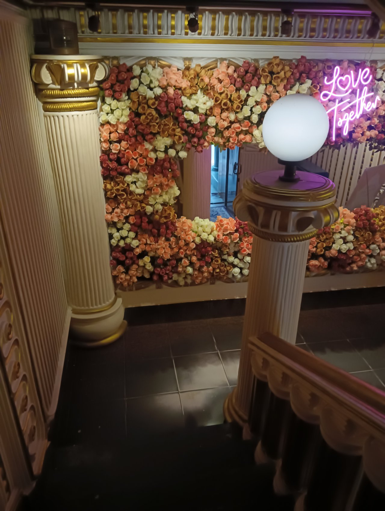 Since the restaurant is on the 2nd floor, there are stairs for it. Where the stairs are beautifully decorated and there are flowers and various types of lighting, it looks quite beautiful. There are pillars in the stairs where the pillars are of different colors and designs, which attracts everyone.