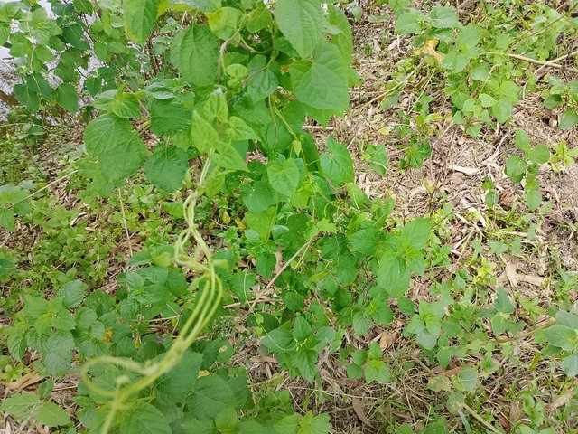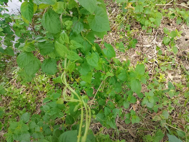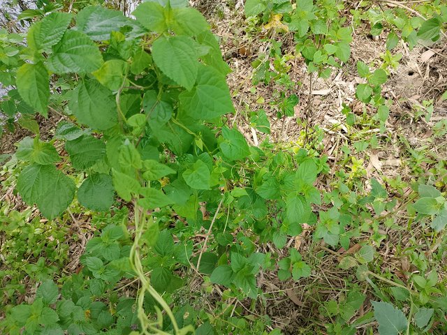 Mikania micrantha leaves The leaves here were green and small in shape. These leaves are mainly like water hyacinth. They grow in different places whenever they find empty spaces, and the same way they had grown here too. The leaves had not been cut, so they remained like this, which made them look quite nice.