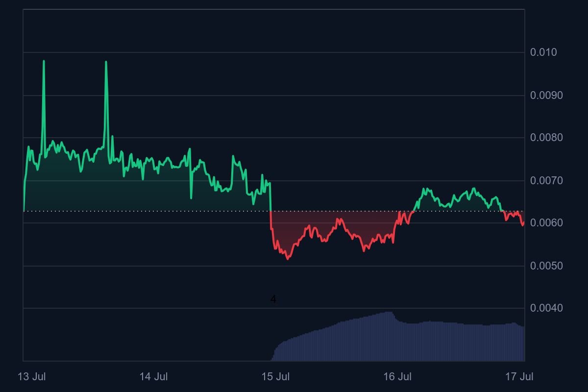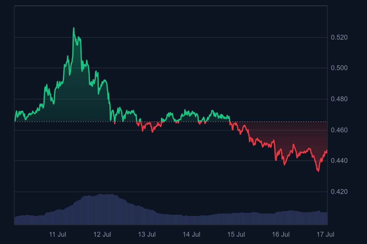 PI started by slowly rising in the very beginning of the week. But on the middle of the week, it lost all its strength and started falling. The fall was sharp and this got halted after a while. It recently slowed down the movement and became stable. The biggest falls happened on 15 July. It is currently at 0.445$, starting from 0.466$ only a week ago. As a result, it's down 4.3% over a week.