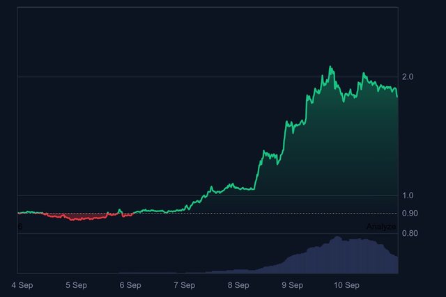 Just like the previous one, WLD, gained a lot of value last week. WLD had a slow bleeding start. It started small and was rated at 0.9$ last week. Afterwards, throughout the week, it gradually pumped and got value. This continued till almost end of the week. Recently, WLD started retesting 1.75$ zone. As of now, the token goes for, 1.79$ per piece. It's a nice 100% move.