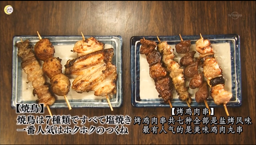 《孤独的美食家》S01E01 | 烤鸡肉串lz69 (25)in #tvshow • 7 years ago Notes 烤鸡肉串,葱肉串,软骨串,鸡皮串,鸡胗串,鸡翅串,鸡肝串,鸡肉丸串。一共七种,全部是盐烤口味。 :好吃,不知不觉就笑了起来。 :用青椒包着鸡肉丸,苦苦的,但是好吃,苦得好吃。 烤多线鱼,有和式风味,洋式风味的区别。 信玄袋,酥皮烤过的袋状油炸食物,内陷是帆立贝和秋葵。 和式干烧饭,加入小银鱼和话梅肉得松散样子,面上撒的是紫苏叶。 :好酸,是话梅肉。 #food #japan #chinese