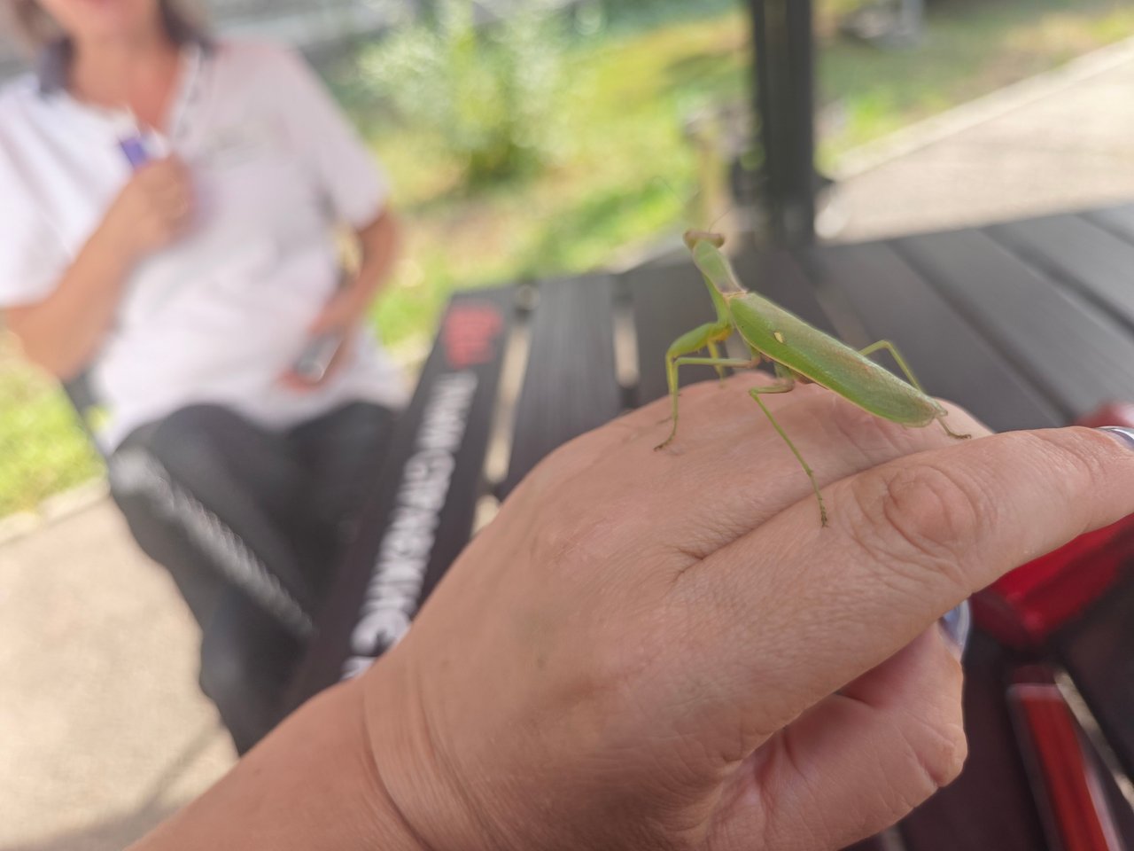 Today, during a break between classes, I decided to stop by the gas station and have a coffee... and then my "girlfriend" joined me. The mantis just climbed on the table, climbed on my hands, climbed on my phone, it seemed that it was not afraid of me at all.