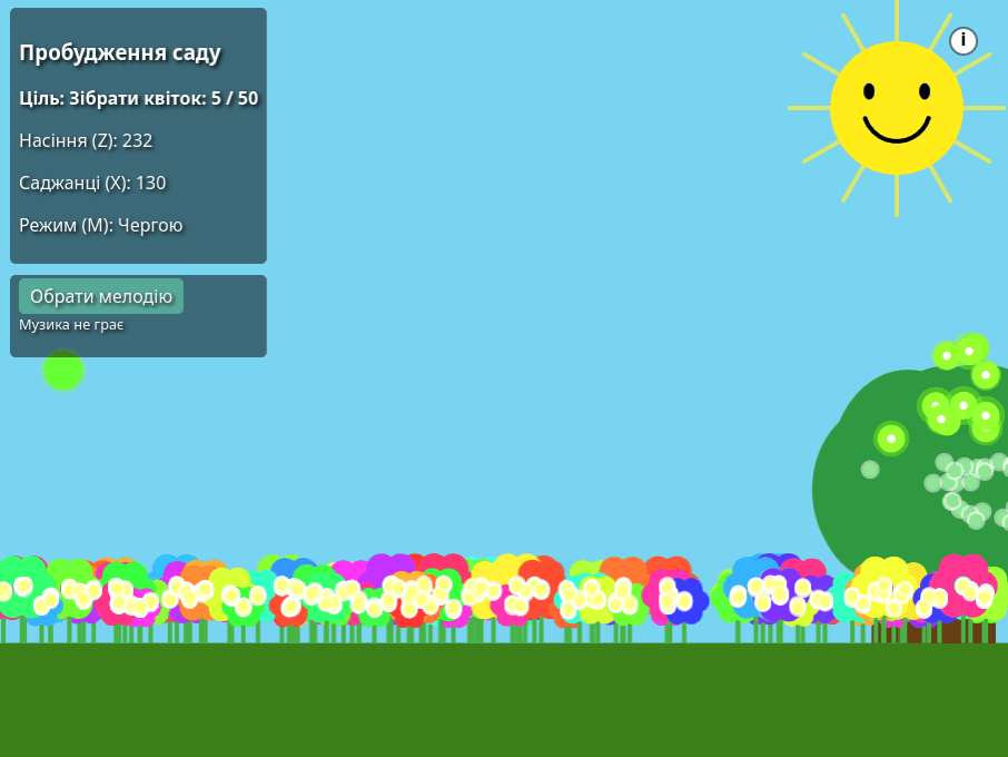 Отже пробуючи створити в ньому гру, подібну до Кобзи по вгадуванню слів, але зі своїм набором слів – словником. І вискочила ідея про те щоб, щось літало й пуляло насінням в землю, яке б проростало й звеселяло. Така собі пісочниця й невелика розрада. Насіння двох видів квіти й дерева. Бо багатьсоко ігор показують шкідництво різного роду, а тут хороше діло.