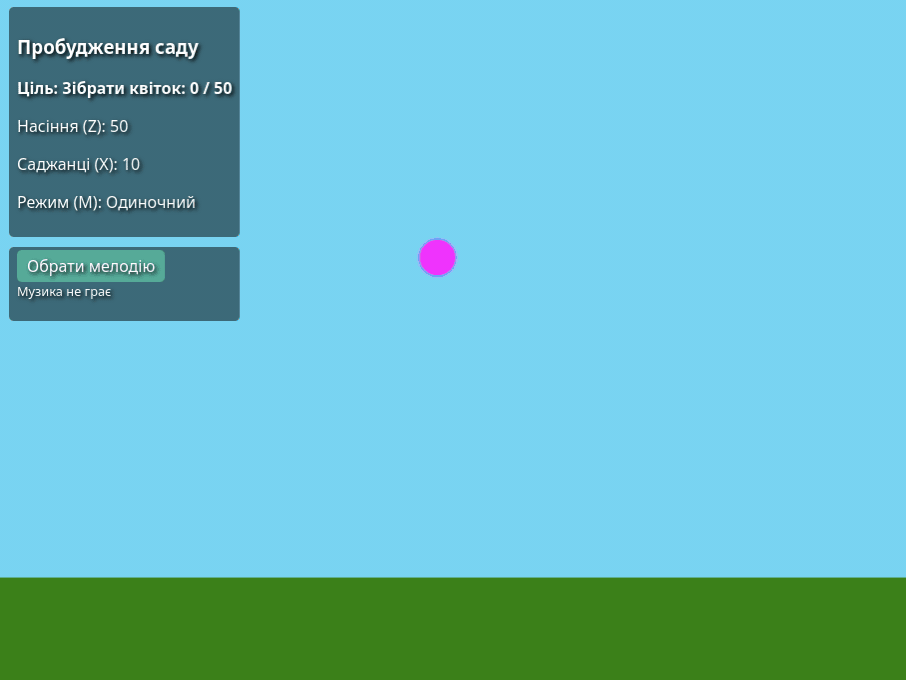 бібліотеку, що все працювало. Вона складається із одного файлу десь 1 МБ. І вуаля. Ще була думка, щоб на фоні грала якась мелодія заспокійлива, але до того діло повноцінно не дійшло чи скрпипт не правильно зроблено. Тож гру можна легко запускати в браузері. Щоб грати на смартфоні, найкраще вигружати на веб сервер як веб сторінку. Принаймні просто так воно не хоче працювати в мобільному браузері, мабуть захист. Локальін рішення є, але це вже танці із бубном.
