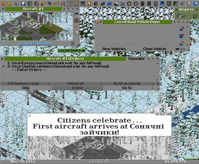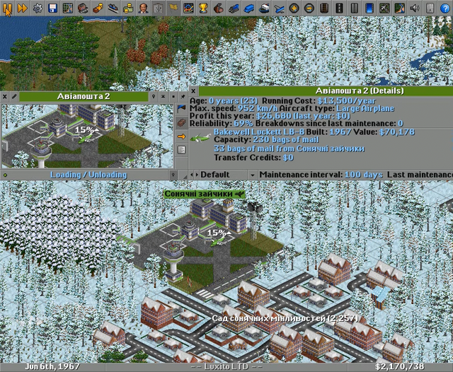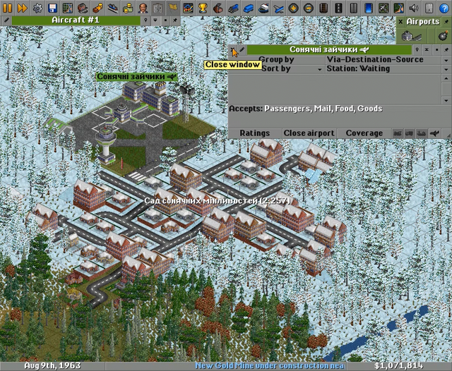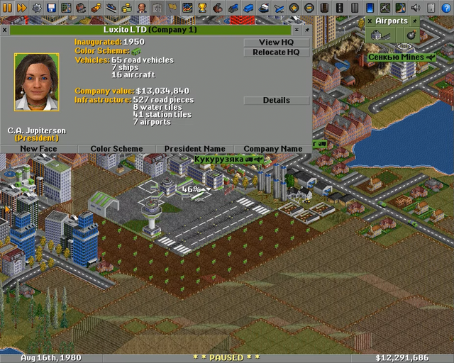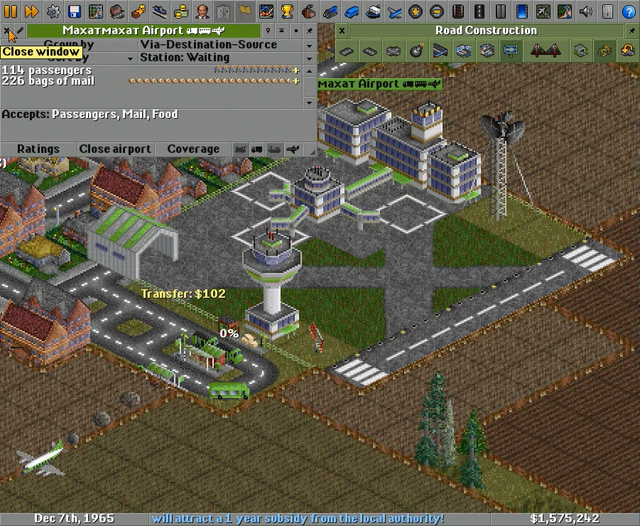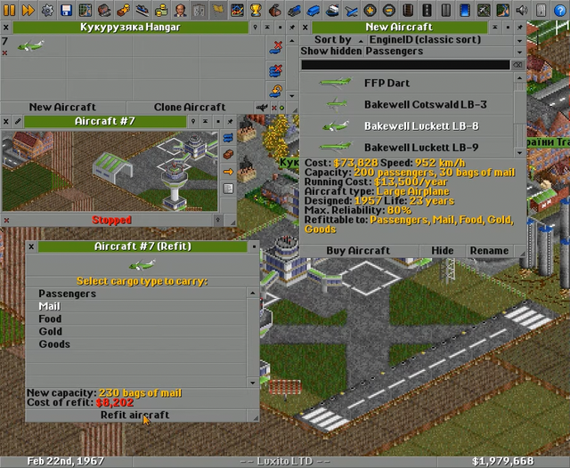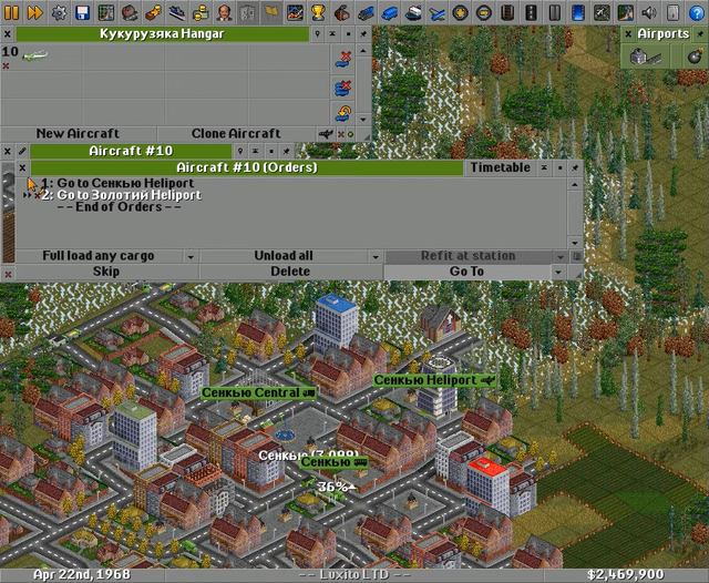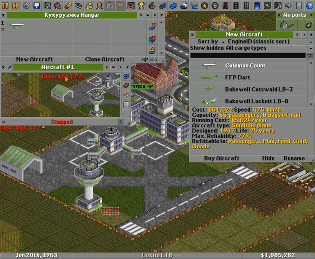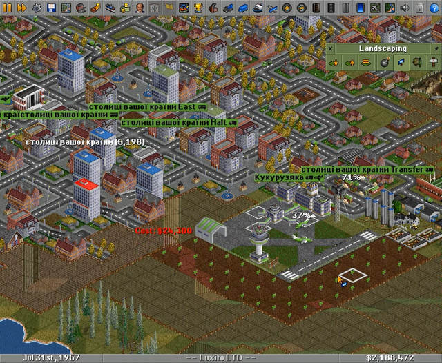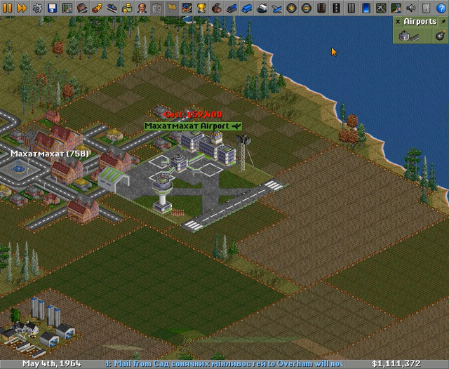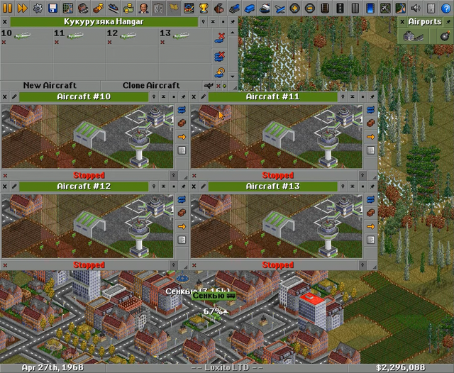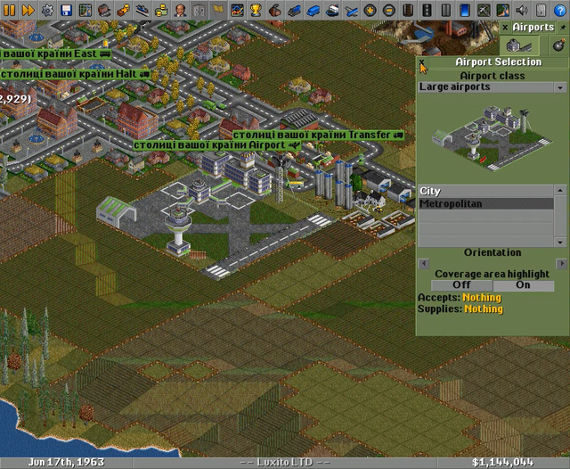 Оскільки місто “столиці вашої країни” добре розрослось, і має сусідне, то біля нього найпідхожіше притулисть аеропорт, величенький 6х6 клітинок, але із однією злітною смугою. І буде ймення йому “Кукурузяка”. Відразу придбано літачок, щоб став на завантаження. Тільки треба було дивитись, там є більші.