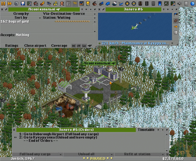 А ген далеко у лісочку знаходиться хороши золотий видобуток. Може то й жирнувато, ставить великий аеропорт біля неє, проте меншого не передбачено. Після покупки й потрібних змін, буде покладено маршрут від “Лісові копальні” до “Кукурузяка”, що біля міста “столиці вашої країни”. Але там нюанс, транспорту на колесах для цього не передбачено, чи то через неуважність або ще шось, маємо просто складування. І на жаль, до банку покриття не дістає, тож там поряд на вільній клітинці, до забудови території, вже втулено вертолітний майданчик.