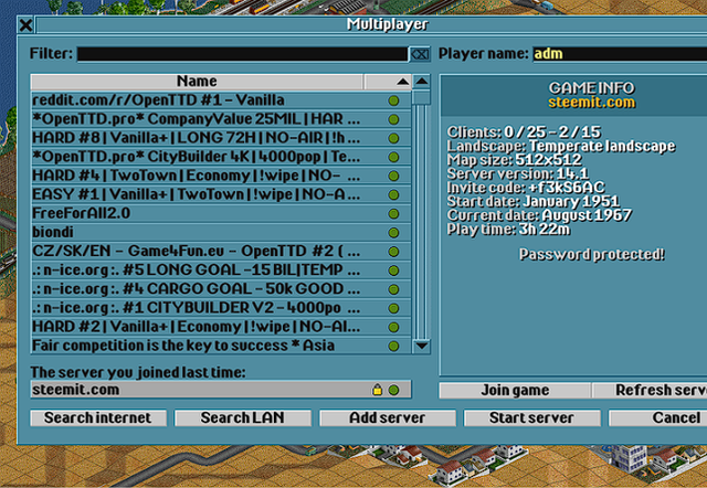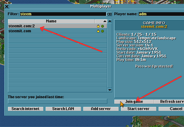 У вікні фільтру вводимо steem - та обираємо сервер зі списку, там має бути лиш один, бо steem.com:2 я створив лиш для того щоб написати цей допис - то ж обираєте steem.com він має бути один, якщо не буде ніякого спробуйте пізніше, можливо мій інтернет або комп'ютер винні.