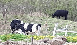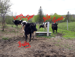 Princess (background) was too busy grazing up on the little hill to join Leroy (foreground left) and Belle’s (foreground right) conversation by the water tub. :D