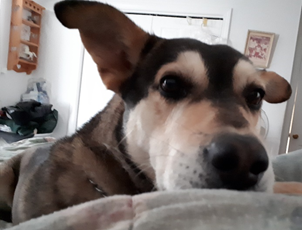 This is what I woke up to this morning, our dapper puppy dad Dakota, looking for a bit of cuddle time with mom. :D