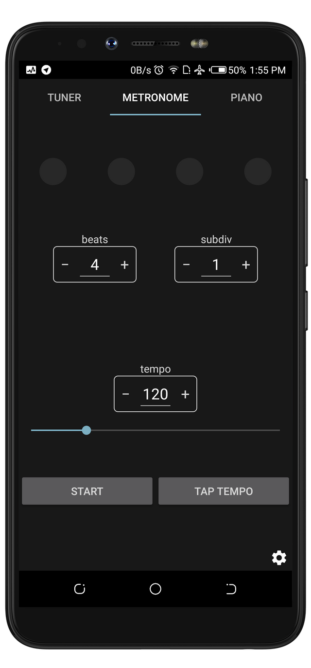 The metronome on Semitone is simple to use because of how the buttons are arranged. It has round circles at the top of the screen which blinks as the metronome counts the beats. The screen also has a beat button which decreases or increases the number of circles on the screen.