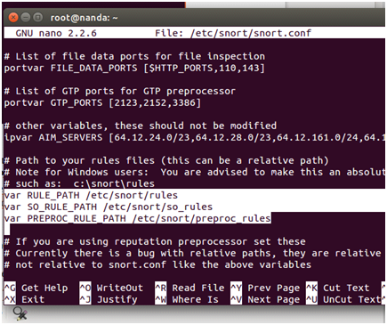 The next step is to create a path that points to /etc/snort/snort.conf by: sudo sed -i's / include \ $ RULE \ _PATH / # include \ $ RULE \ _PATH / '/etc/snort/snort.conf , next step edit the snort configuration using nano editor, by: nano /etc/snort/snort.conf, then edit line in line 45 by press ctrl + w + t fill 45, then edit it to resemble the following settings: