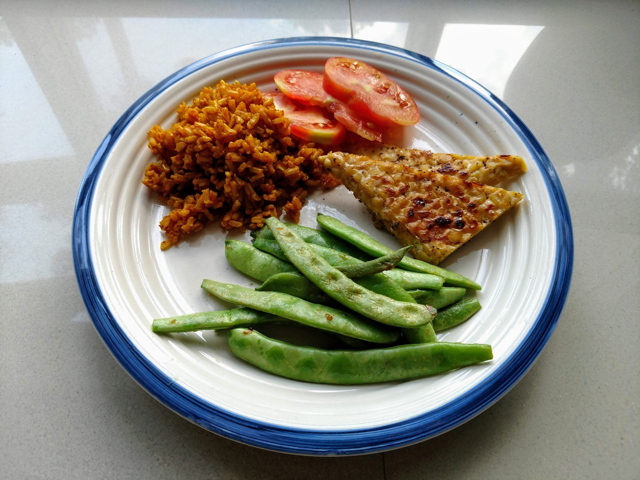 I cooked long grain brown rice with a mixture of chili powder, ground turmeric, and ground cumin for a bit of flavor. I had also recently gotten some new delicious balsamic vinegars, so I used Garlic Cilantro White Balsamic to marinate sliced tempeh before also cooking on the stove top. That was delicious!