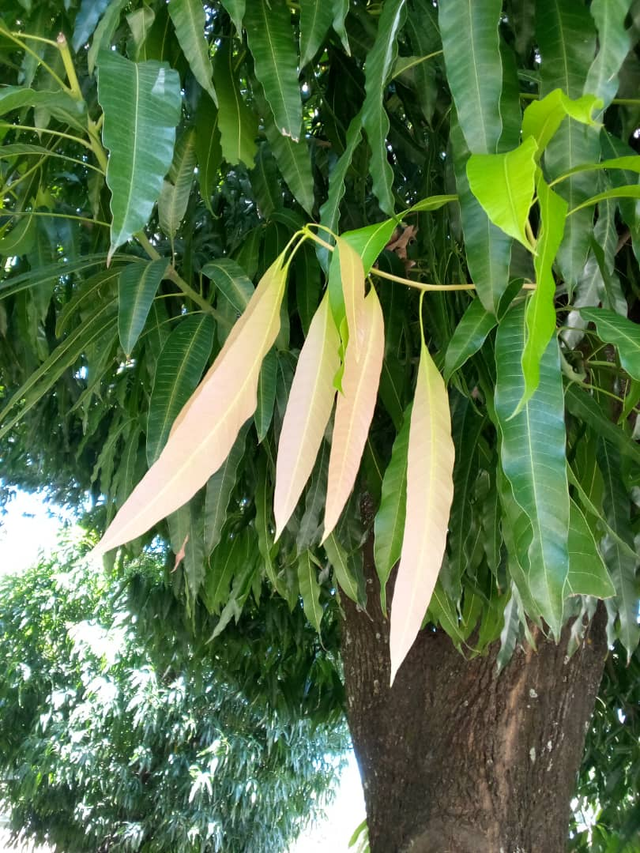 Otro día, mirando las hojas, de una de las cuatro o cinco matas de mango que tenemos la dicha de tener en la Residencia donde vivo, observe el color miel en las hojas nuevas, bueno yo las veo con esa tonalidad.