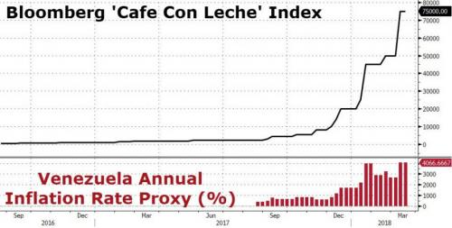 Bloomberg explains that, as the name would suggest, it tracks just one item: a cup of coffee served piping hot at a bakery in eastern Caracas. Its price has jumped to 75,000 bolivars from 1,800 bolivars over the past 12 months, an increase of 4,067%.