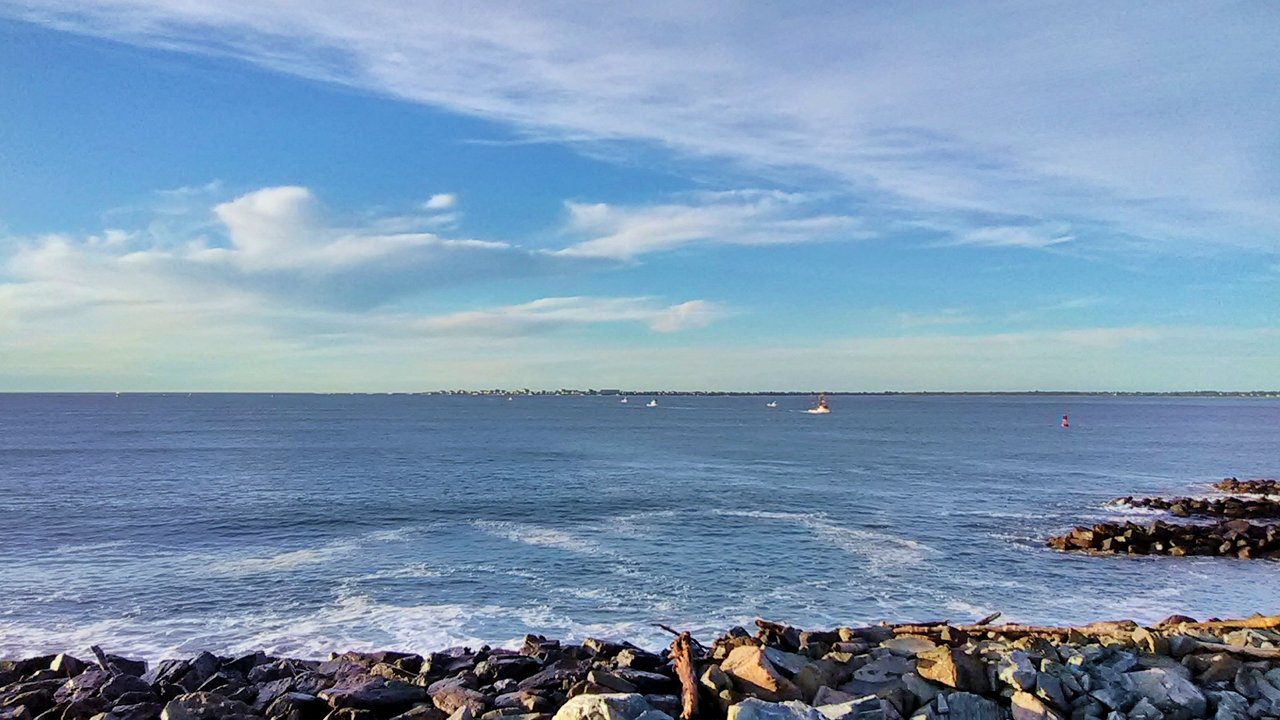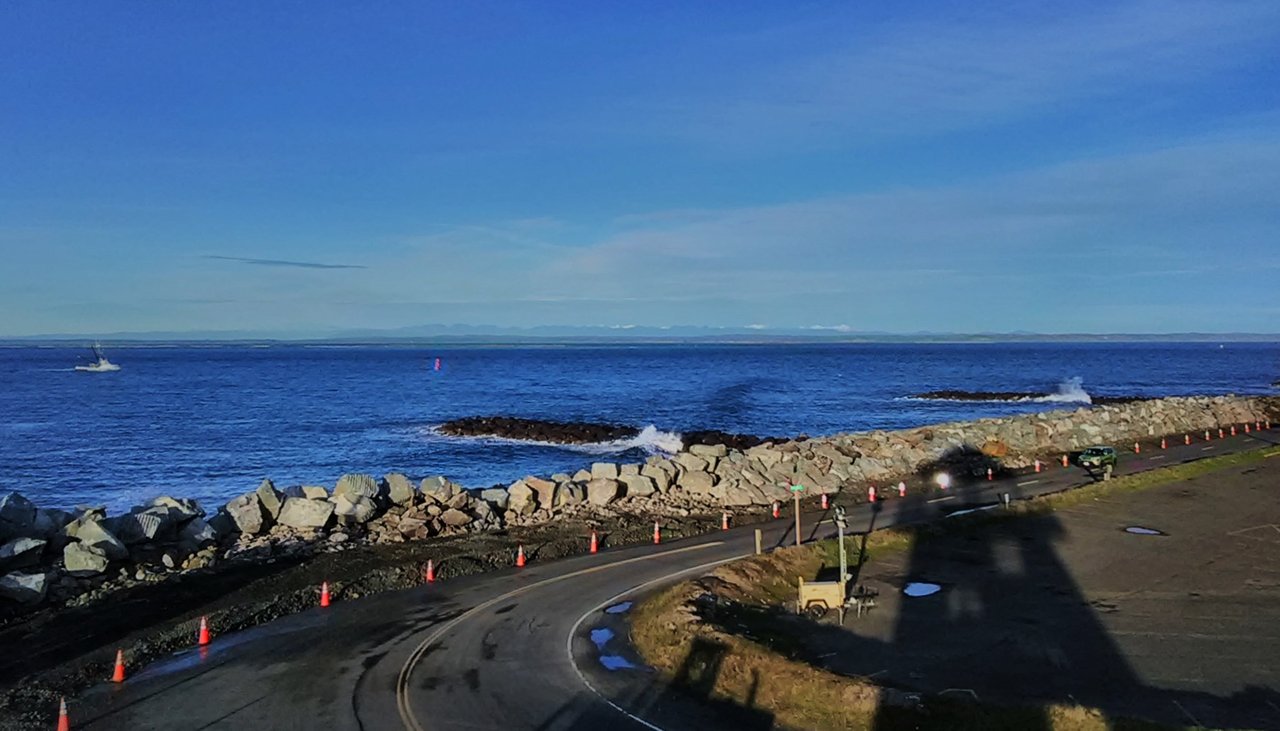 Waves crashing on the jetties. They're adding rocks (boulders really) to the seawall; that's the shadow of a front-end loader parked next to the viewing tower.