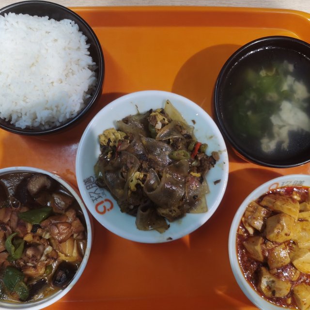 昨天的午饭简直是打工人的快乐补给站!在“玖膳”家点的套餐,一碗喷香白米饭打底,香菇鸡块软嫩入味,每一块都裹满浓郁酱汁;梅干菜鸡蛋炒粉皮口感绝了,粉皮Q弹,梅干菜的咸香和鸡蛋的嫩滑融合得恰到好处;麻婆豆腐麻辣鲜香,拌饭绝绝子;还有一碗清爽的青菜豆腐汤解腻。荤素搭配+汤饭齐全,味道在线又管饱,打工人的幸福感瞬间拉满,这样的工作餐请给我来一打!